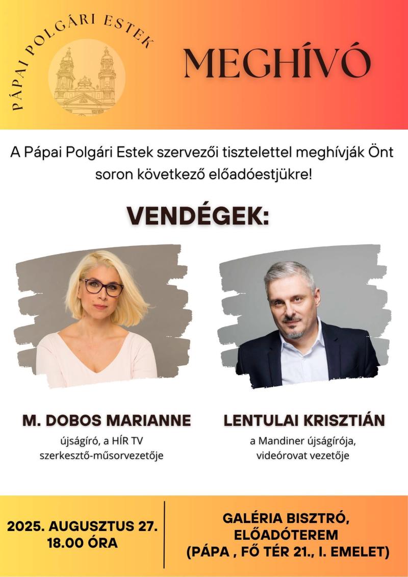 A Pápai Polgári Estek következő vendégei: M. Dobos Marianne és Lentulai Krisztián